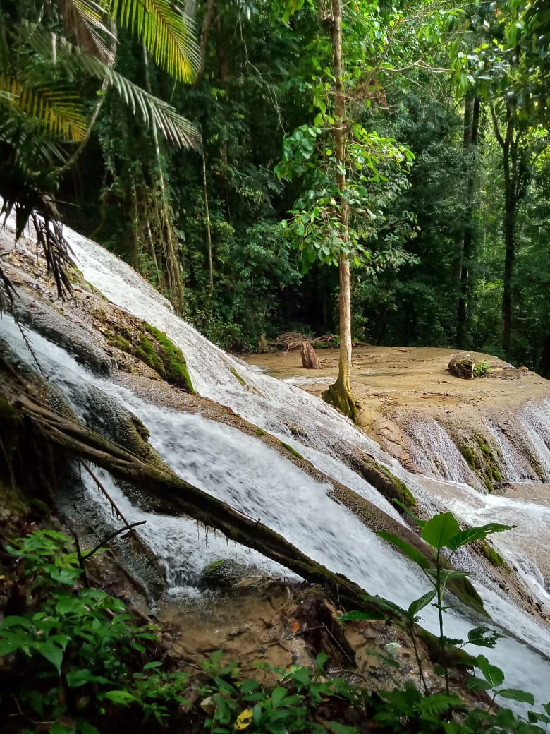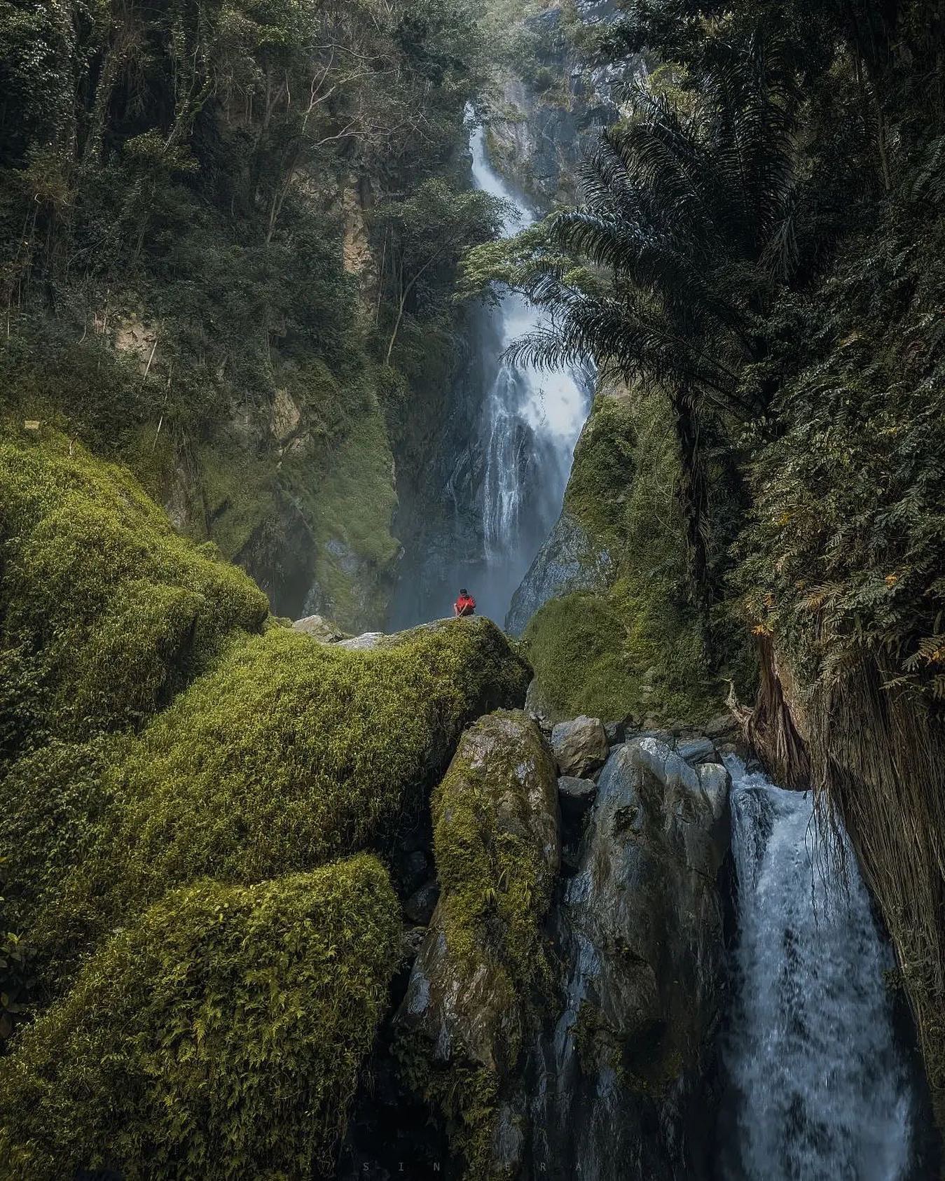 Untuk mencapai lokasi air terjun, wisatawan harus melanjutkan perjalanan kurang lebih sekitar 2 km. Air terjun ini memiliki beberapa tingkatan dengan ketinggian air terjun utama sekitar 80 m dan kemiringan antara 70°-80°. Aliran